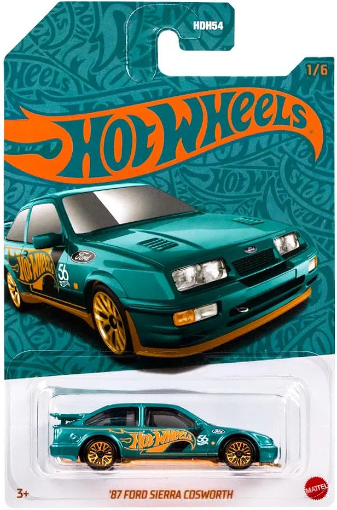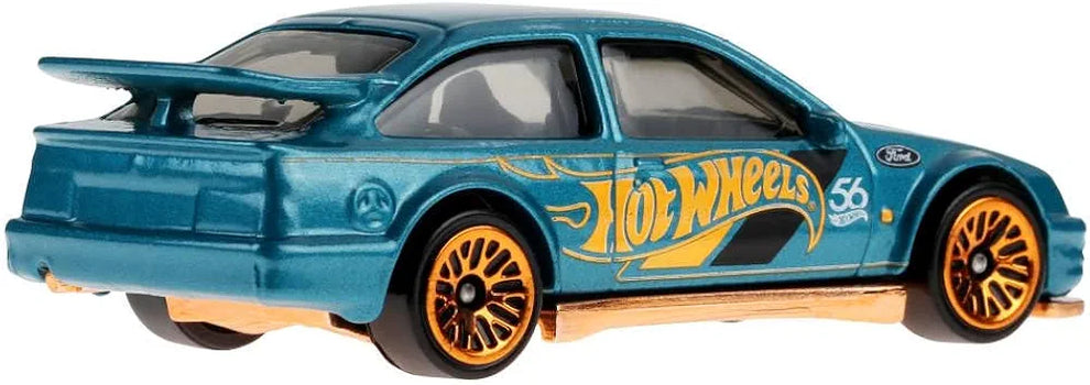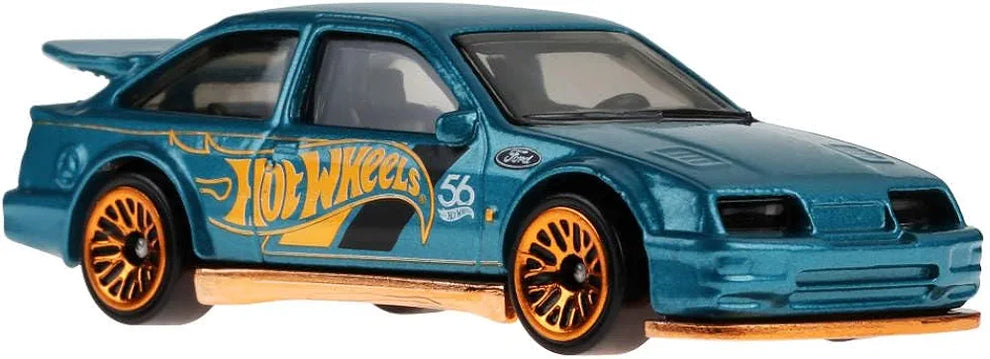 Hot Wheels 1:64 scale die-cast vehicle 87 Ford Sierra Cosworth with turquoise- and copper-colored deco to celebrate HW 56th anniversary